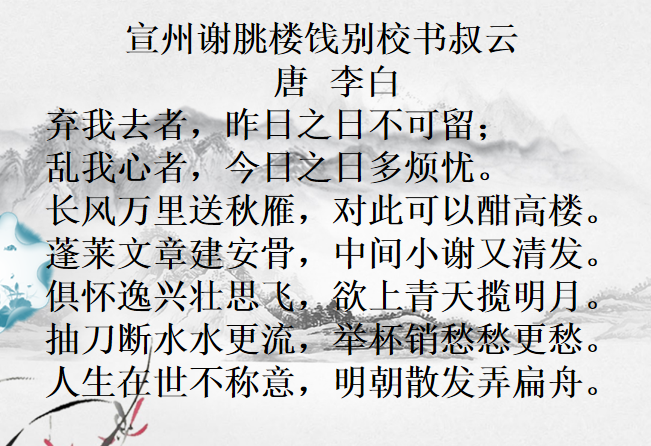 陈:诗人一开头,把对时光无法挽留的遗憾和心中无限的忧愁交叉叠加起来,渲染自己无尽的失意和失落之情。然后笔锋陡转,把同好友李云在路上仰天所见的景状写出:“长风万里送秋雁”。散发出对万里秋光的无限热爱。